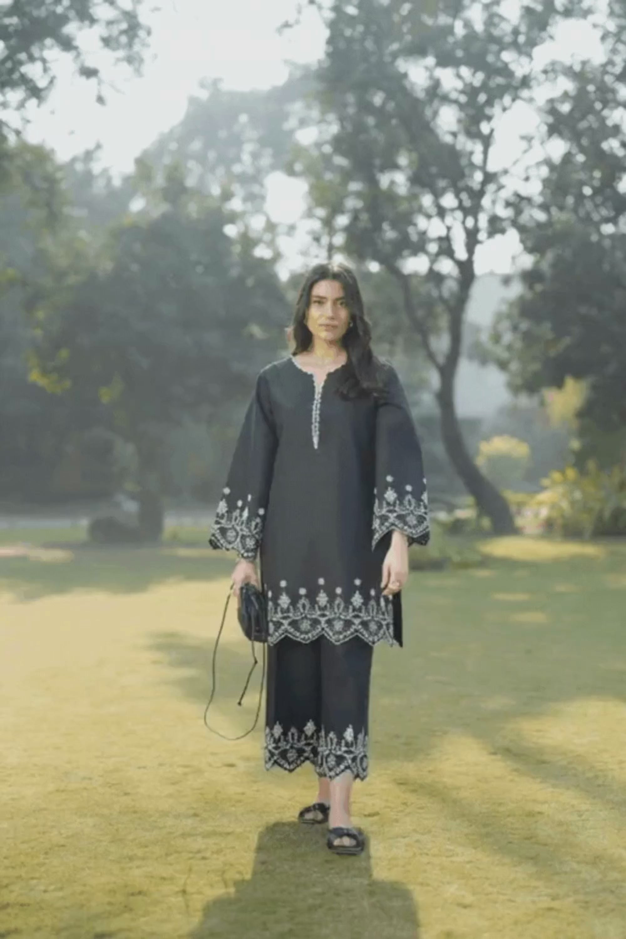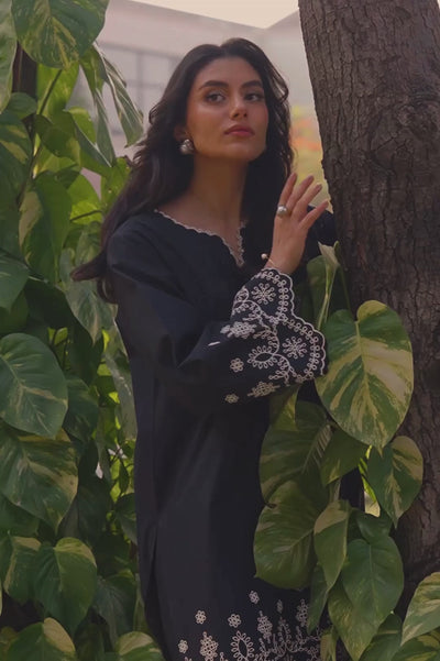 The Onyx Medallion co-ord set features an embroidered V-neck kurta with delicate lace and a scalloped hem, paired with straight-cut embroidered trousers for an effortlessly polished look.