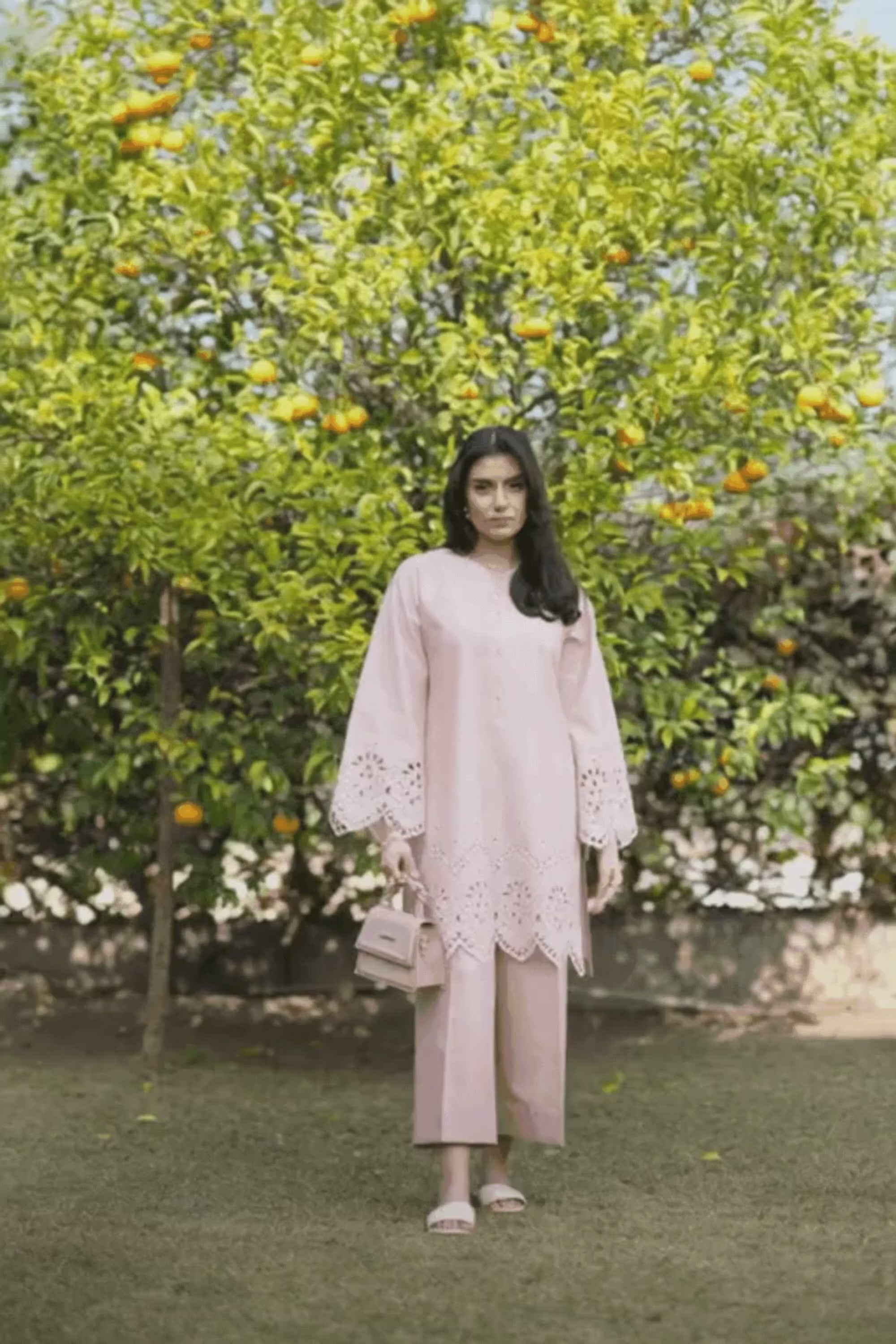 The Rose Wood co-ord set features an embroidered V-neck kurta with fabric button detailing and a scalloped hem, paired with straight-cut trousers—crafted in soft lawn and cambric for breathable comfort and refined, everyday elegance.